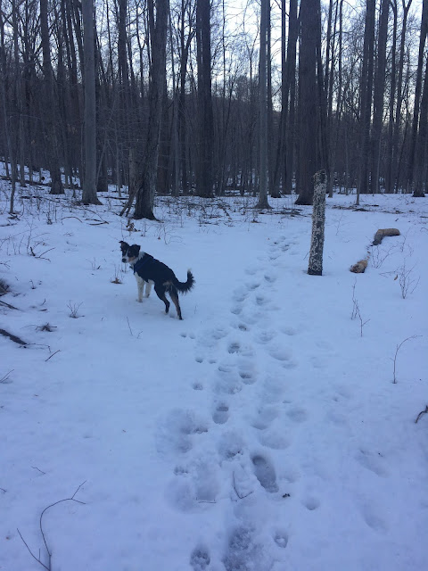 There were only 2 cars in the parking lot and the trails were slushy. I brought microspikes, but didn't want to use them, lol. I didn't know how slow we'd be (since I've been spending a lot of time trying to train loose leash walking), so we took the short red trail. After a short ways, I decided to try hiking with Krummholz off leash. We've done a lot of recall training, and being on the red trail we would be unlikely to meet other people or dogs. He ended up doing really well for his first off leash hike. I brought most of his dinner with me, and some string cheese thrown in. We hiked and must have done 50 recalls or so. He stayed within 30 feet of me. I also rewarded him if he came to me without being called.