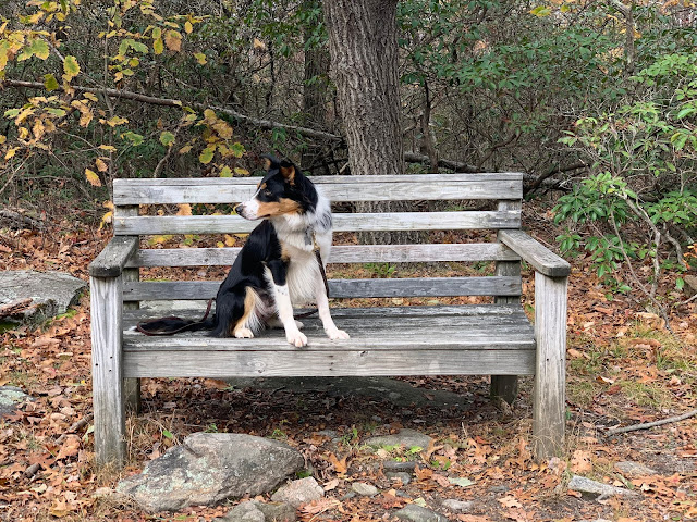 We needed another short hike today, so we headed to Ward Pound Ridge. I hike with my dogs on leash there, so I only brought Krummholz. We mostly had the trail to ourselves, which is uncommon on a weekend. The fall foliage was spectacular. We took Krummholz to the river at the end of the hike. He doesn't like swimming, but we figured we'd give him a chance. He ran to the water's edge and just stared. We tried throwing sticks, but he wasn't buying it. I threw a dog treat next to him, and he didn't eat it - he was too fascinated with watching the water.