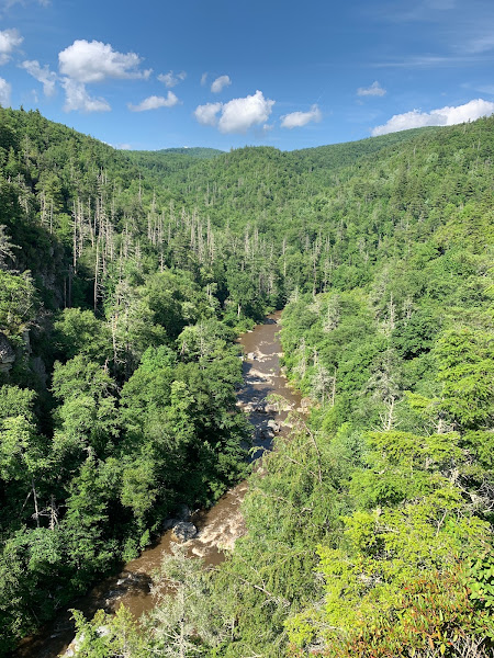 From the visitor center, and crossed a river. Where the trail split, we first headed to the right to see Chimney View, Gorge View, and Erwin's View. We turned back, and then visited the Upper Fall's View on the way back. We are saving the Linville Gorge Trail (also from the visitor center) for another trip. This hike was crowded! So many people. The views are worth the trip however. The hike itself is moderate. The terrain is mostly easy, and the trail has a number of steps.