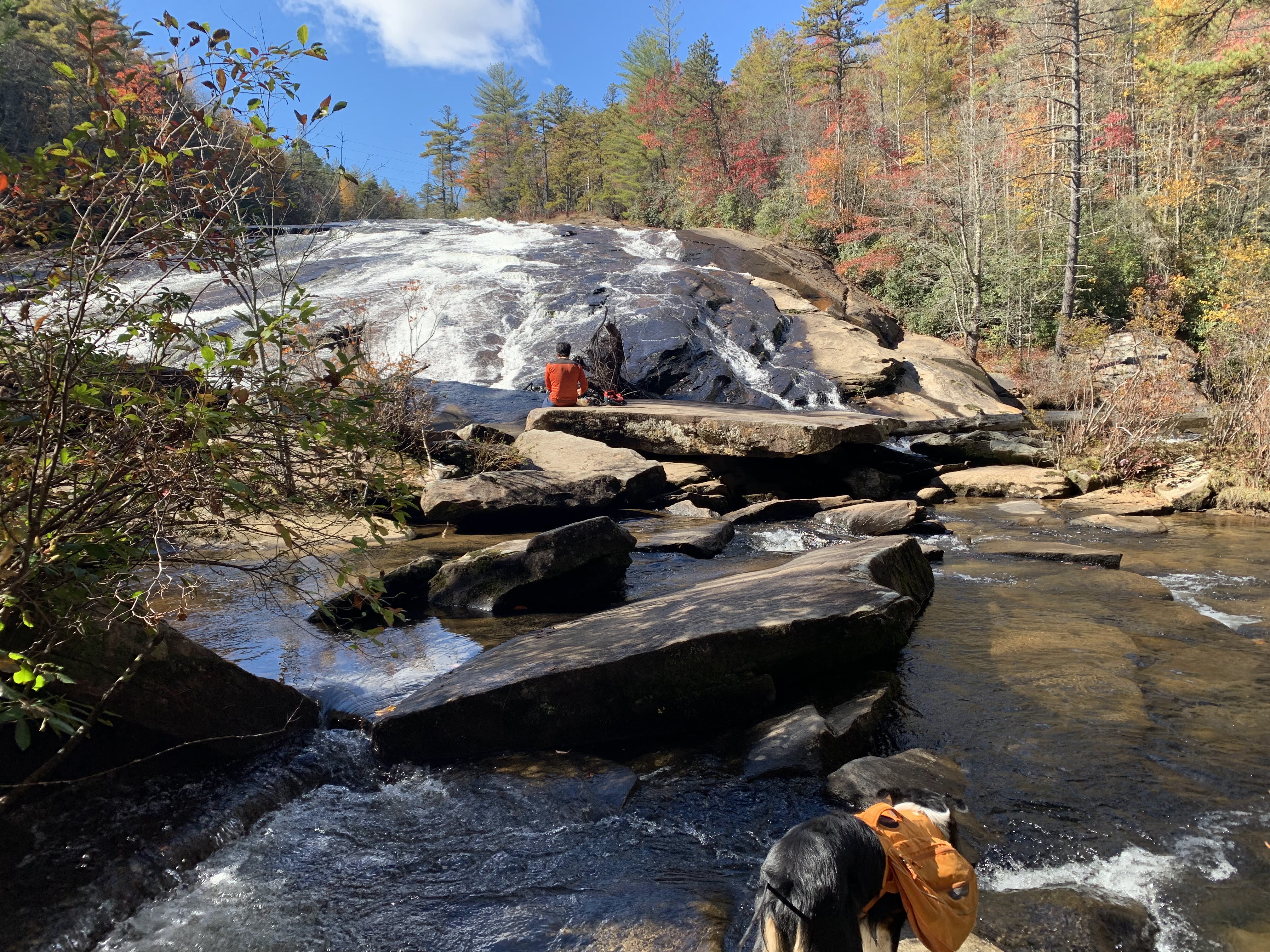 We saw the occasional biker and hiker, but it wasn't crowded at all. The trail was mostly dirt trail with a few roots, not very rocky. I'd call this an easy/moderate hike. It was very quiet and peaceful, and I enjoyed looking at the fall foliage. This is a loop hike, with the waterfall closer to the end. There was one bicyclist at the waterfall when I arrived, and he left soon after I got there. So, we had the waterfall to ourselves. I was surprised, as there were a lot of cars in the large parking area (mostly bicyclists). We stopped at the falls and had a lunch break. The waterfall has one drop at the beginning, and then a second drop, where the water cascades thinly over slickrock. Beautiful! Based on what I read in the North Carolina Waterfalls book by Kevin Adams, this waterfall was used in the filming of the Last of the Mohicans and the Hunger Games.